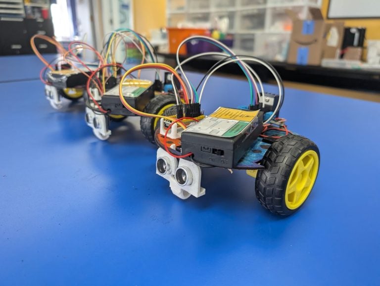 Students assemble and wire complex electronic components, including the microcontroller, motor driver, and sensor, to a battery pack to create a fully functioning robotic system.